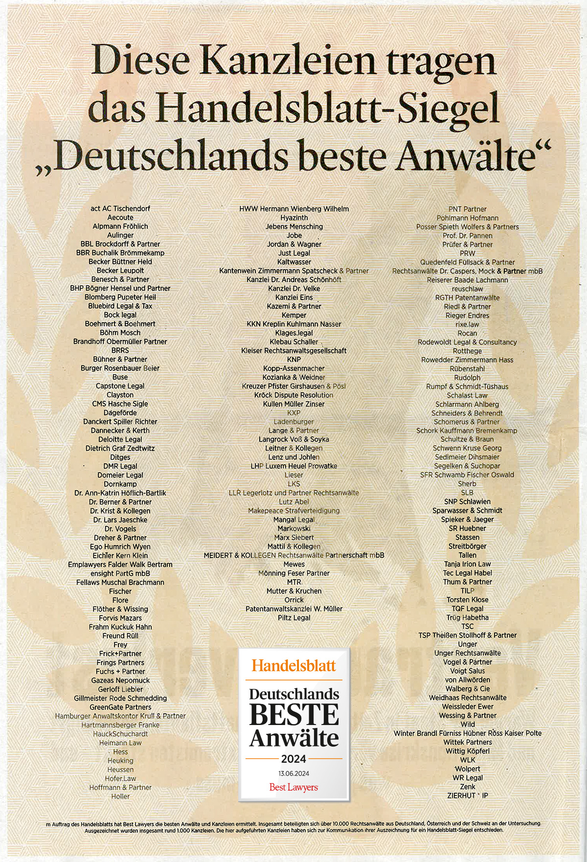 Das Handelsblatt berichtet in seiner Wochenendausgabe vom 30.-31.08, 01.09.24) darüber, dass die Bühner und Partner Rechtsanwälte in die Liste „Deutschlands beste Anwälte“ des Handelsblatts und des internationalen Fachmagazin Best Lawyers® für das Jahr 2024 aufgenommen wurden.